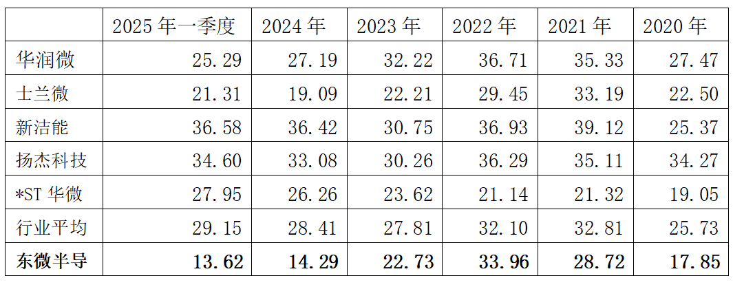 利润跌幅明显高于收入跌幅的背后,最直接的动因是竞争力不足导致的毛利率滑坡。对比可知,相较于同为MOSFET厂商的竞争对手华润微、士兰微(600460)、新洁能(605111)、扬杰科技(300373)、*ST华微(600360)而言,公司过去几年的毛利率水平普遍低于可比公司的平均水平。且自2023年开始,东微半导的毛利率开启了断崖式下跌,自2022年33.96%高位一路跌至2023年、2024年的22.73%、14.29%。并且,从公司2025年一季报数据看,公司的毛利率表现仍尚未企稳。